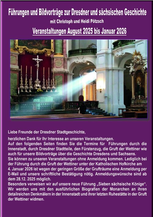 Wir haben aus unseren Bildvorträgen zu „Kurioses, Merkwürdiges und Seltsames aus der Sächsischen Geschichte“ besonders attraktive Einzelthemen zu einem etwa 90-minütigen Vortrag zusammengestellt und kommen damit gern zu Ihrer Feier.
